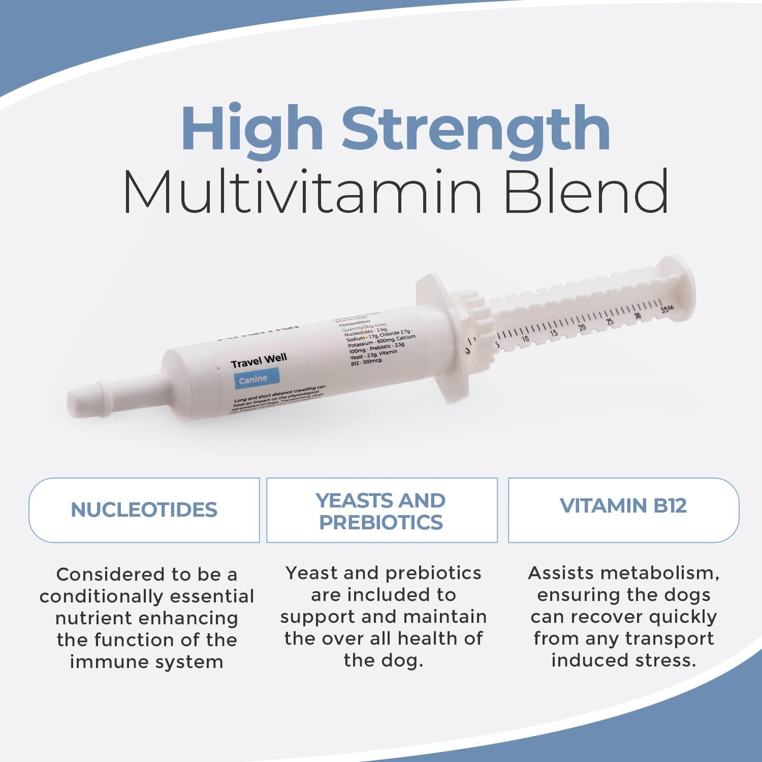 Travel well paste has been formulated to contain electrolytes, Nucleotides have also been included for their positive impact on the overall health of the dogs, they are considered to be a conditionally essential nutrient enhancing the function of the immune system and supporting recovery as well as regeneration of damaged cells or tissues. During periods of increased stress, such as travelling, nucleotide demand exceeds the supply available and additional levels are required. Yeast & Prebiotics have also been included to support and maintain correct digestive health, the inclusion of Vitamin B12 assists metabolism, ensuring the dogs can recover quickly from any transport induced stress.