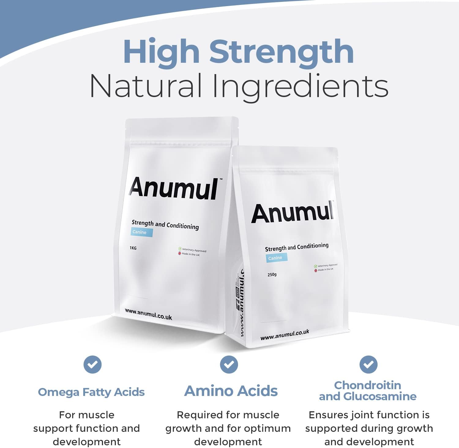 Anumul Strength and conditioning contains a broad range of essential vitamins on a high protein base. This combination of vitamins and minerals is vital to allow optimum development of the dog throughout training, development and other important stages of your dogs life.